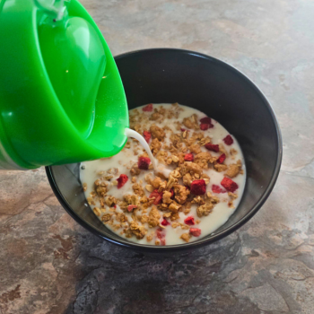 CrunchGo peut contenir un peu moins de 2 portions généreuses de céréales et de lait. Parfait pour tenir toute la matinée ou partager un petit-déj avec un proche !