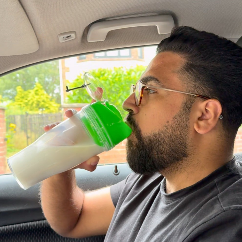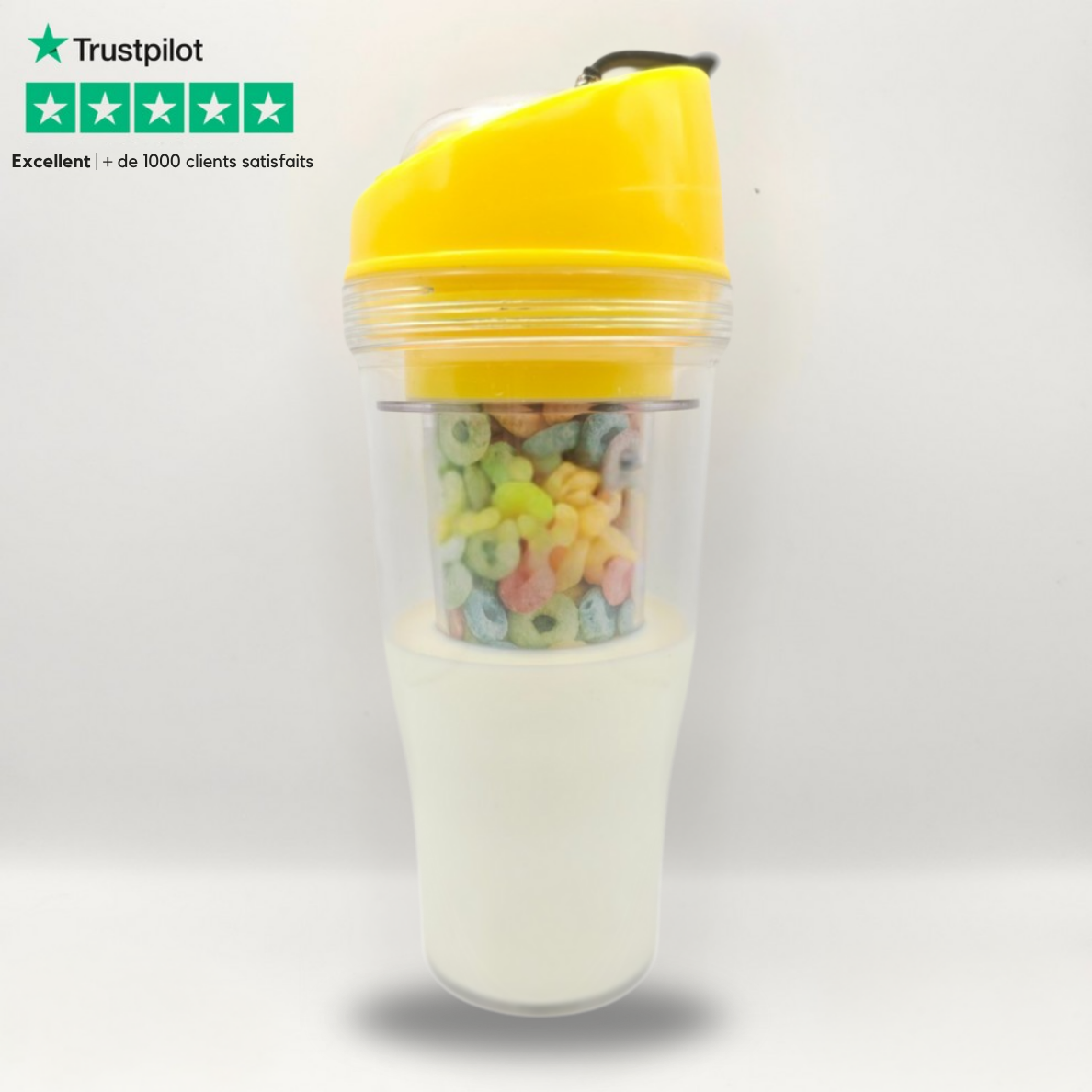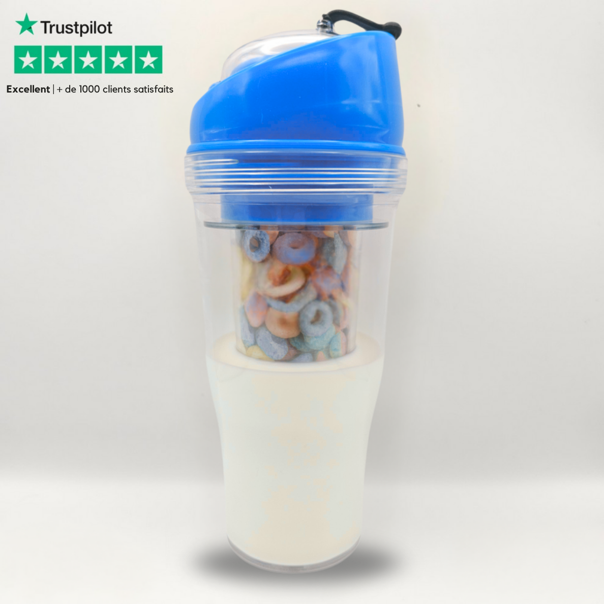 Que vous soyez en retard pour le travail ou l’école, posé sur le canapé ou toujours en mouvement, ce gobelet à double compartiment, réutilisable et pratique, rend le petit-déjeuner amusant et facile.