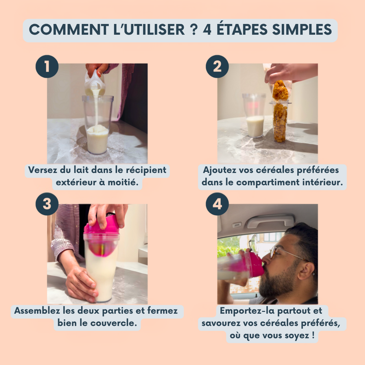 Ajoutez vos céréales préférées et clipsez le couvercle supérieur.